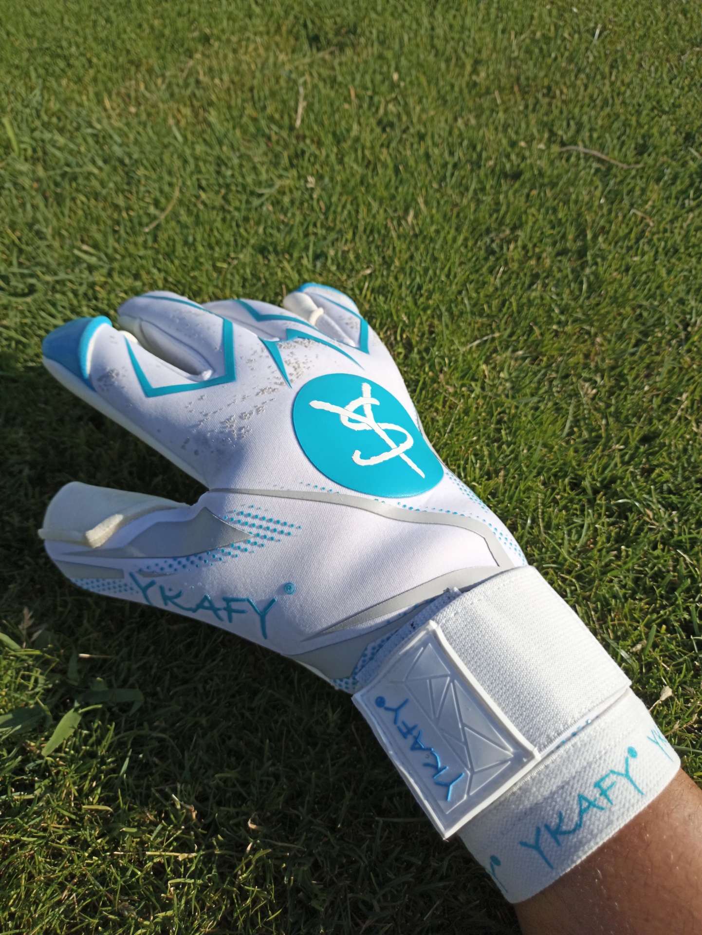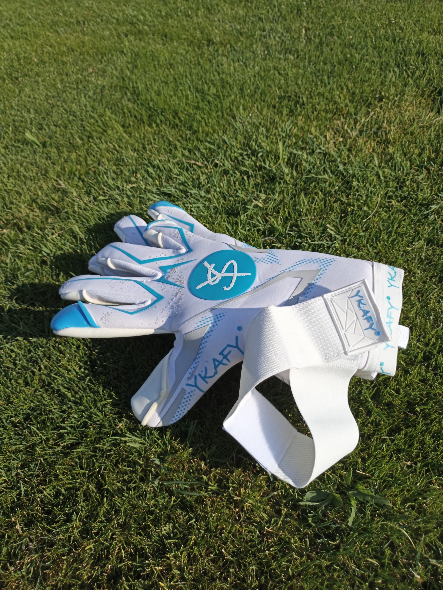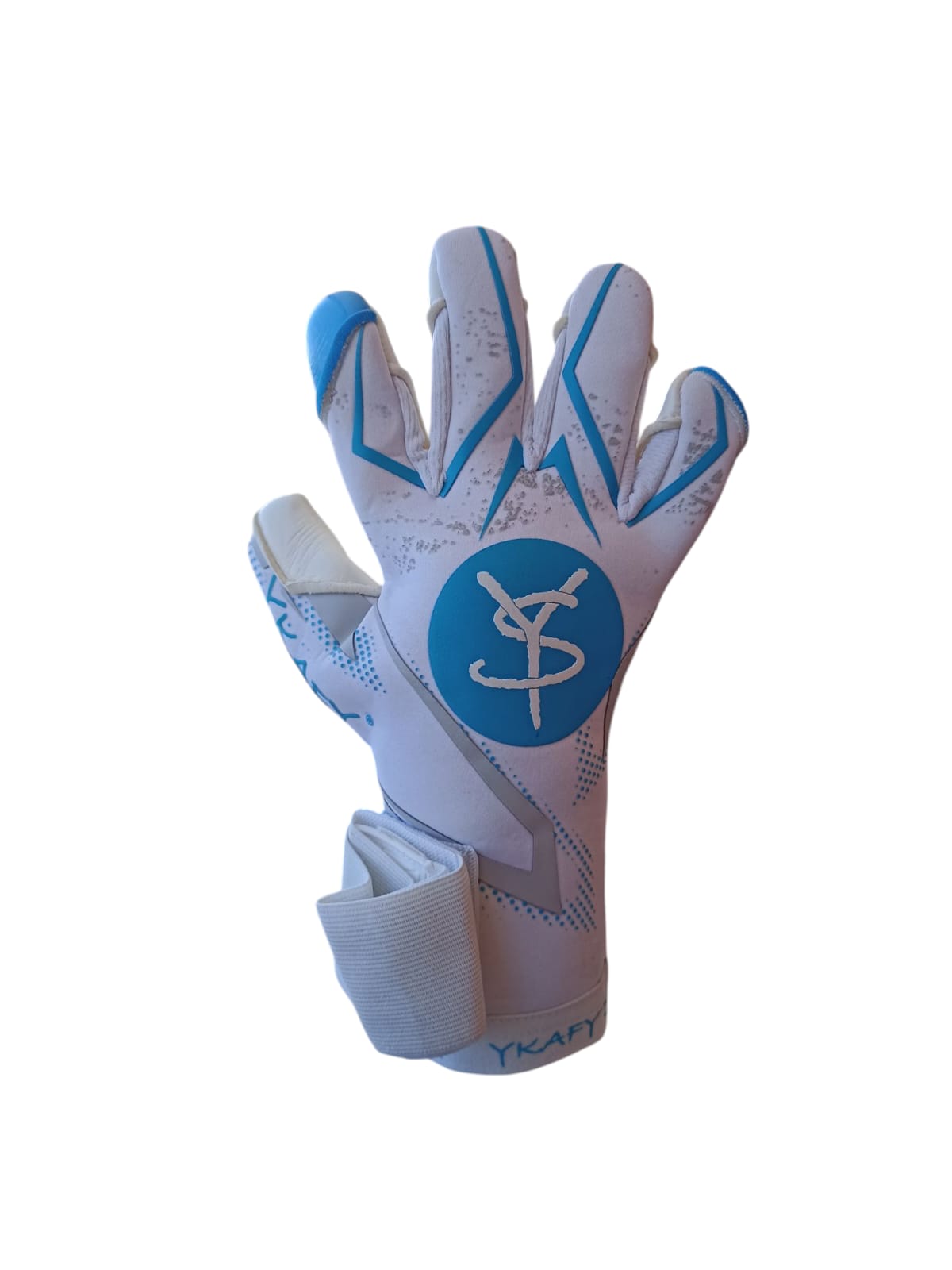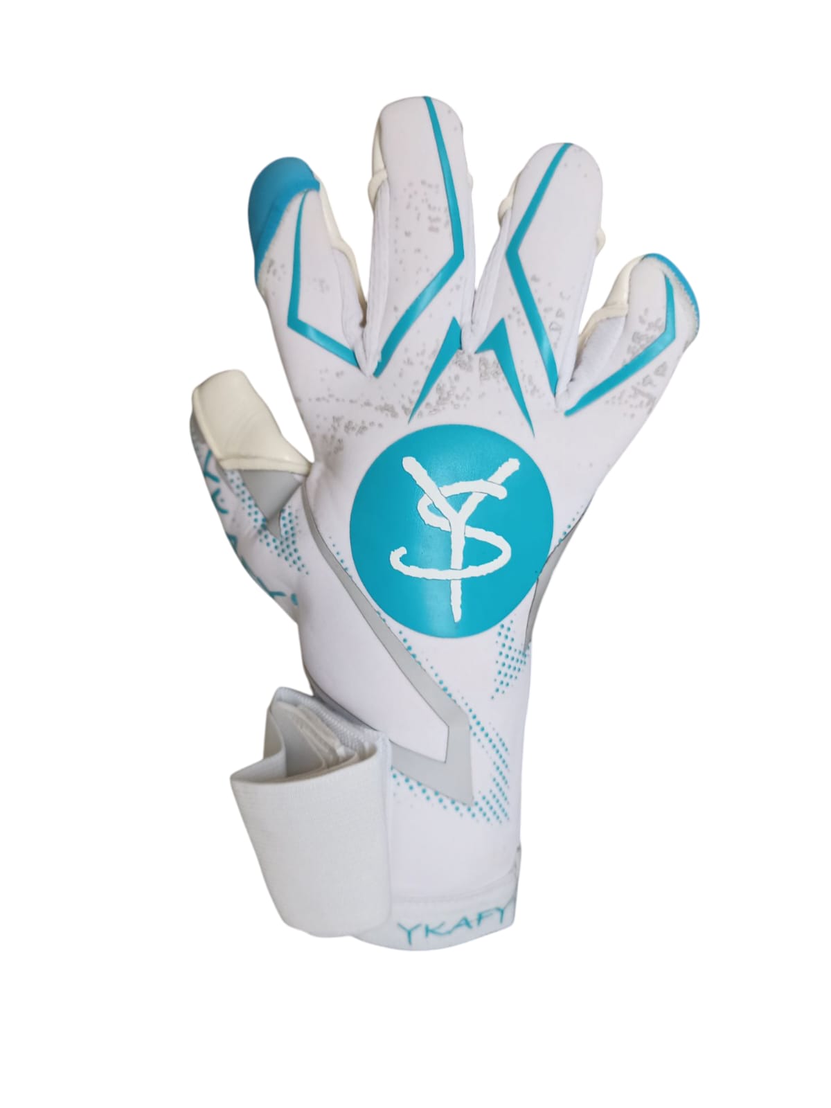 Luva desportiva branca com detalhes azuis e logo YS azul na palma