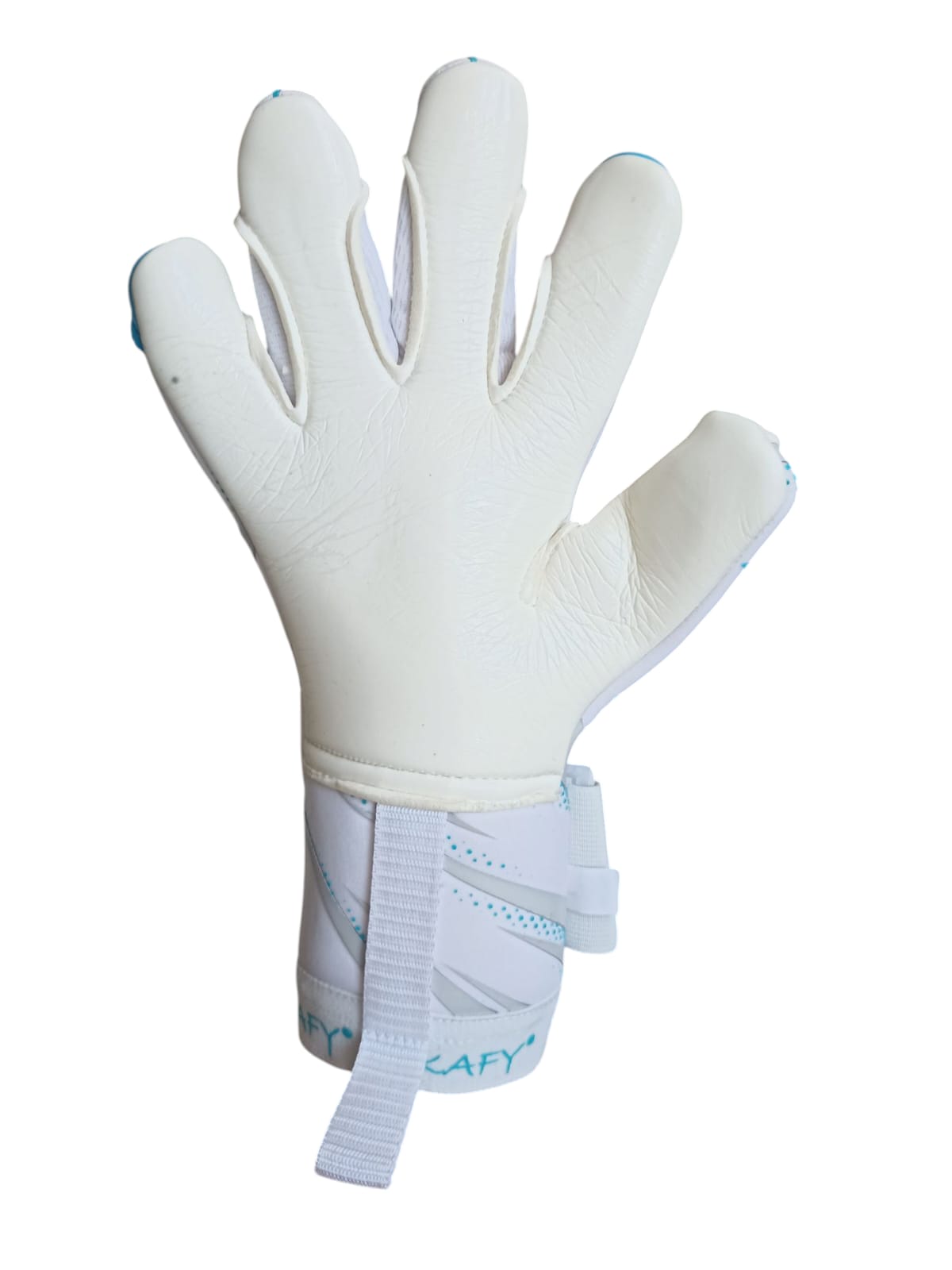Luva de guarda-redes branca com detalhes azul claro e faixa ajustável no pulso