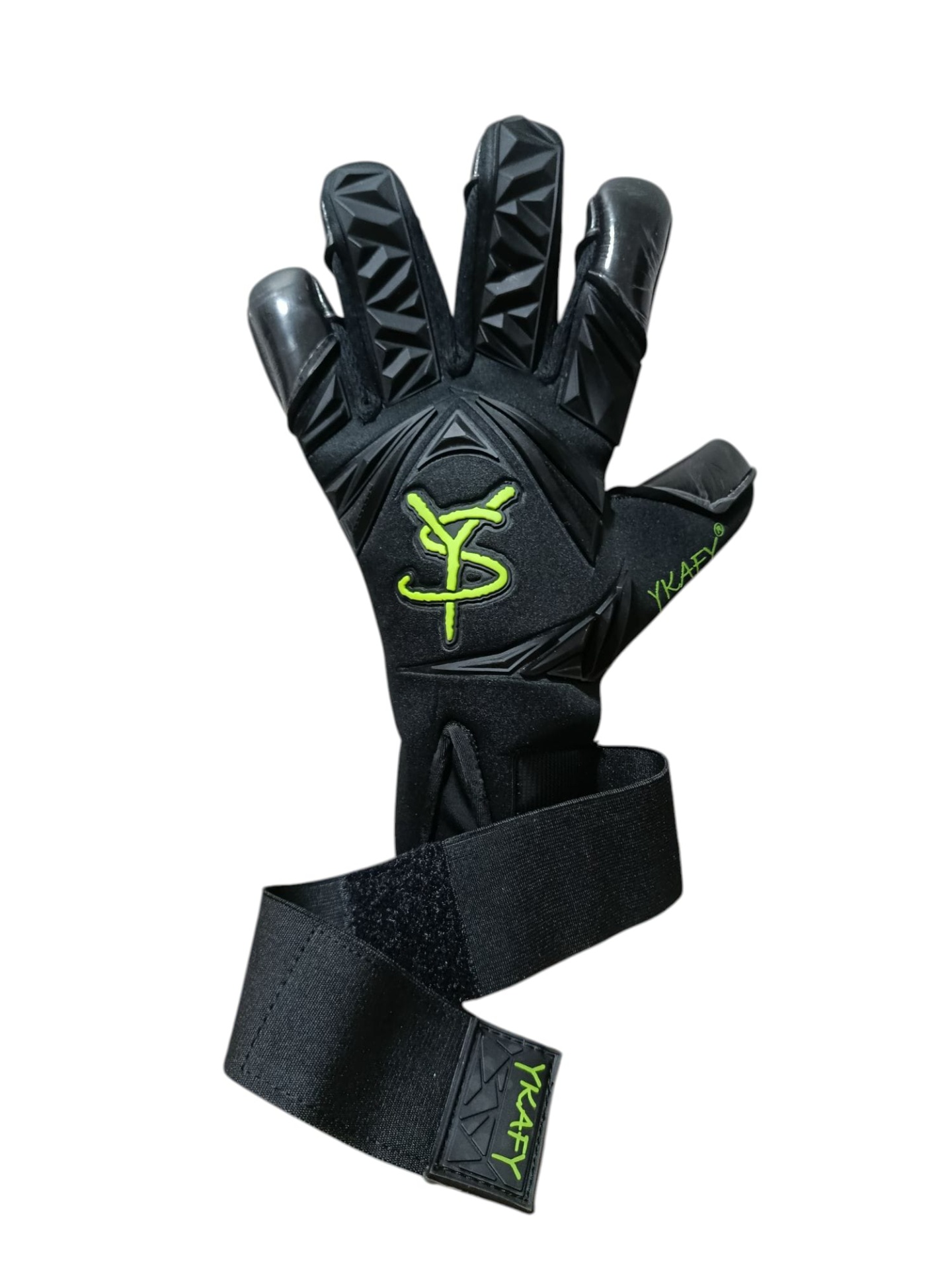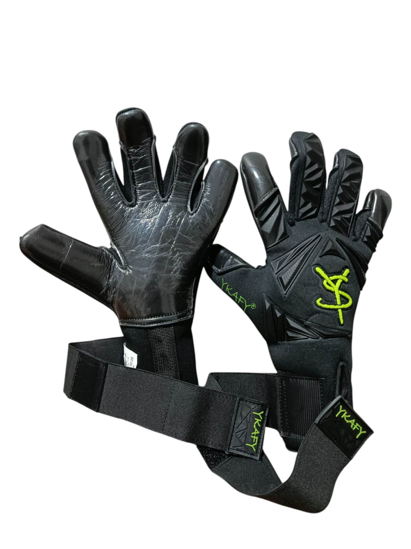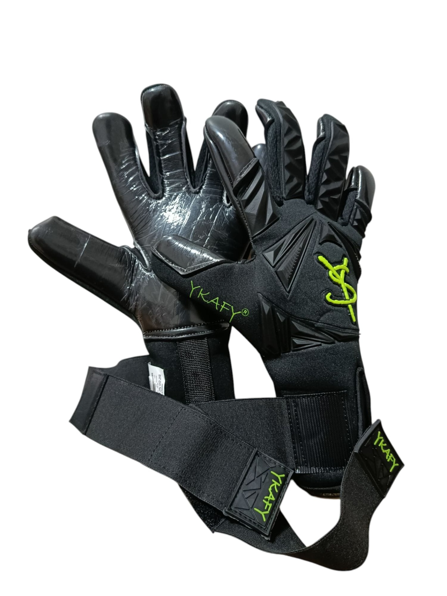 luvas de guarda-redes pretas com verde fluorescente e tiras de velcro YKAFY